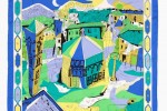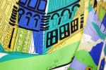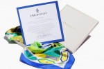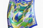 Each “Pucci SOS Battistero”scarf is accompanied by a hand-signed thank you note from Laudomia Pucci, daughter of the brand’s founder. The artwork is faithful to the original motif but presented in a new, vibrant colour combination of luminous blues and greens. An “Emilio Pucci Made in Italy” tag is sketched into the corner next to the decorative printed border that frames the outer edges.
