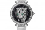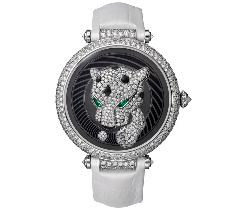 This complicated Diamond Panther Watch has no hands, but paws. The playful diamond panther with emerald eyes, a symbol of the Cartier High Jewelry house, is emerging from the center of the high-jeweled dial set with 255 brilliant-cut diamonds.