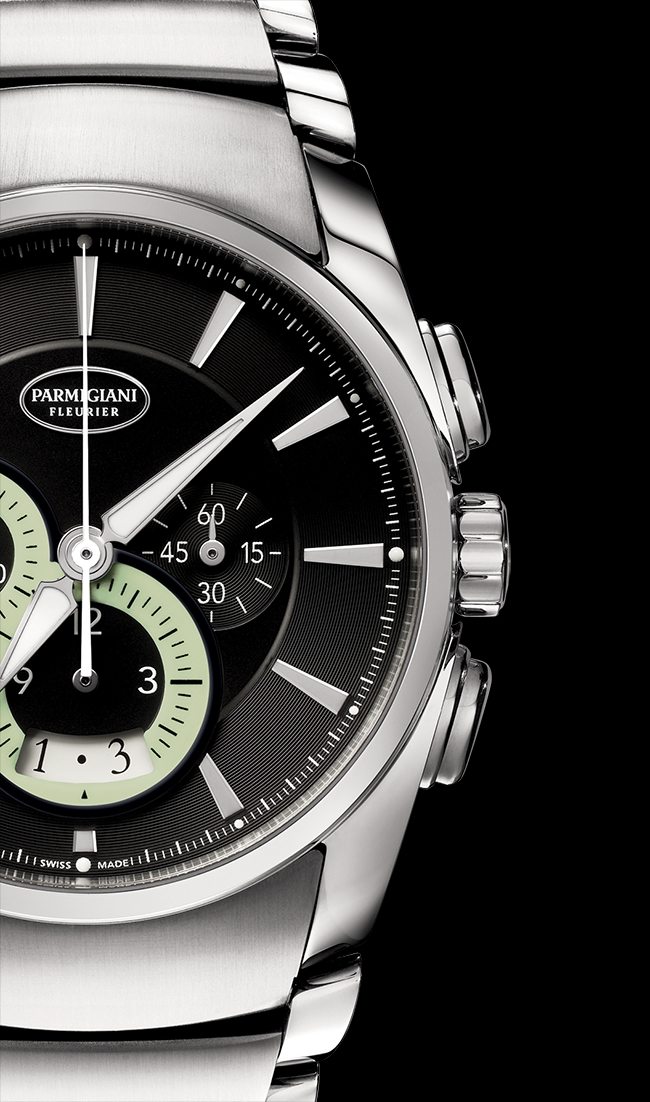 The chronograph complication is showcased by the striking presence of the hour and minute counters.