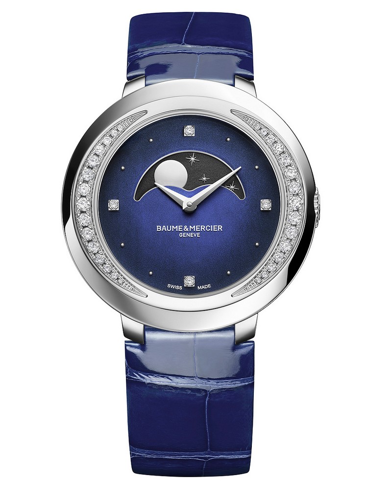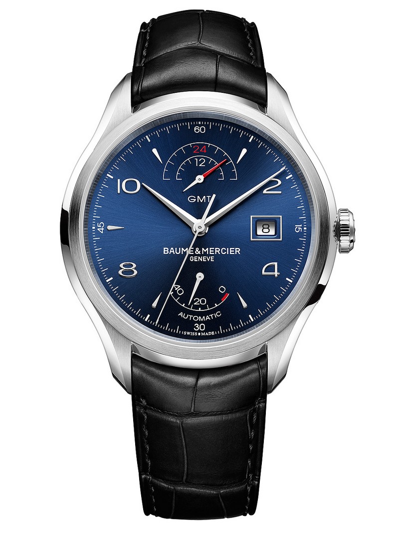 Baume & Mercier’s 43mm Clifton GMT Power Reserve and the 34mm Promesse watches both feature midnight blue dials. A round 42mm,automatic GMT watch for men, the Clifton 10316 comes with a sun satin-finished blue dial, aSwiss made automatic movement with GMT and 42h Power Reserve functions and is delivered on ablack alligator leather strap.