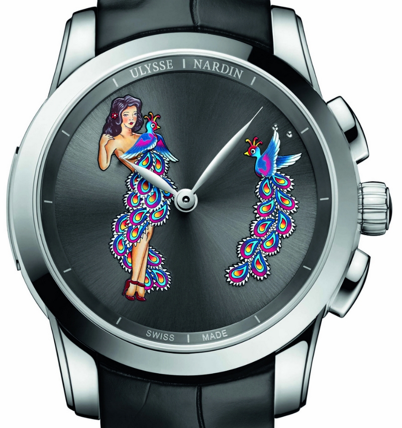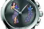 Ulysse Nardin Classico Manufacture Reference 3203-136-2/E3 comes with a “Grand Feu” blue enamel dial. The Classico Rooster watch celebrating the Year of the Rooster is crafted using the champlevé technique. The watch focuses on an intricately crafted dial featuring an enamel rooster. Limited to 28 pieces, Ulysse Nardin Hourstriker Pin-Up watch presents a dancer covered by little more than a peacock. To reveal the dancer behind, the hourstriker function must be activated.