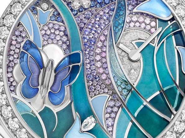 The butterfly also flutters its wings while the watch is being wound via the crown, then, when the barrel has been fully charged, it rests to indicate that no more winding is necessary.