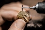 On the reverse, a majestic yellow gold sun, with nine rays of different sizes, stands out from the mother-of-pearl background. Its almond-shaped eye and its smile were defined with a subtle level of refinement. The ornamental stones have been polished to give them a rounded surface, while the gold that encircles them has been shaped to form a rice-grain effect.
