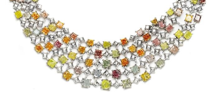 Through stunning examples, such as the fluorescent lighting of a “rainbow” diamond necklace and a very rare Victorian Orchid Diamond, the exhibition will bring to light the rare properties of colored gemstones, the science behind natural colored diamonds, and how the interplay of light and