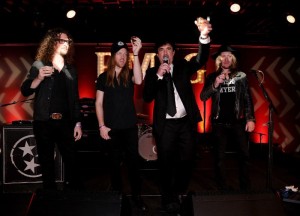 Kelby Ray and Neil Mason of The Cadillac Three, Scott Borchetta, and Jaren Johnston of The Cadillac Three toast on-stage at the BMLG After-Party on November 5, 2014 in Nashville, Tennessee.