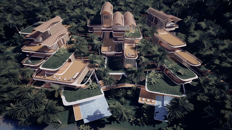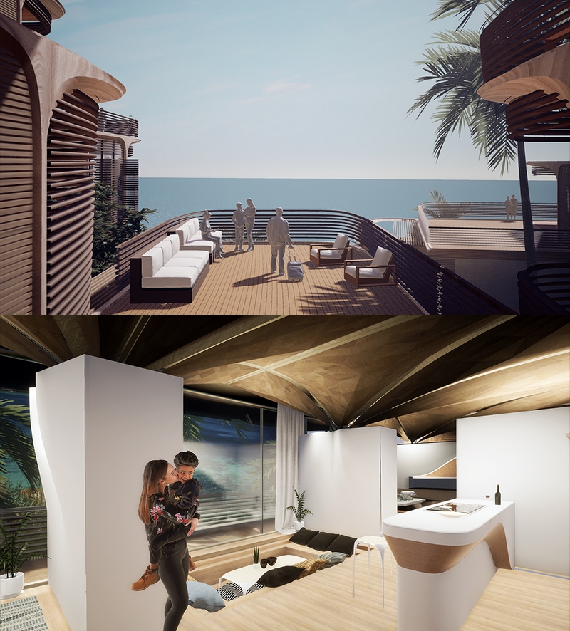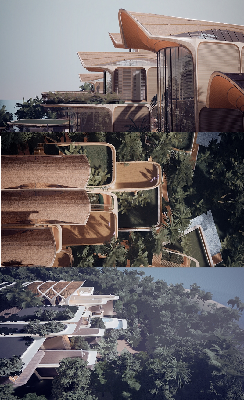 The design’s modular system is founded on the use of sustainable timber, sourced nearby from certified forests on the Honduran mainlandand treated locally, to form the main structural elements. Digital information technologies will optimize the use of all parts of the sustainably-forested logs to minimize waste and pollution. This process also contributes to reducing the embedded construction energy and carbon footprint of the development.