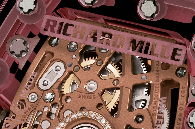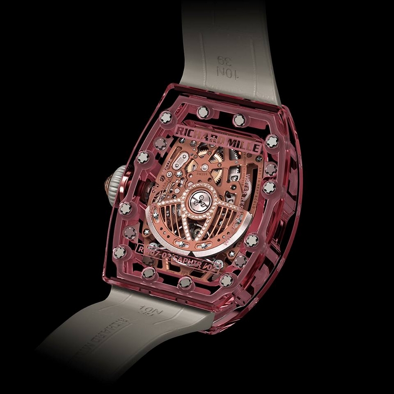 Crafted from sections of pink sapphire taken from a single block, the case of the RM 07-02 is extremely difficult to machine.