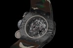 Skeletonised, automatic winding movement with variable-geometry rotor offering hours, minutes, seconds. Flyback chronograph, 60-minute countdown timer at 9 o’clock, 12-hour totalizer, oversize date and month indicator.