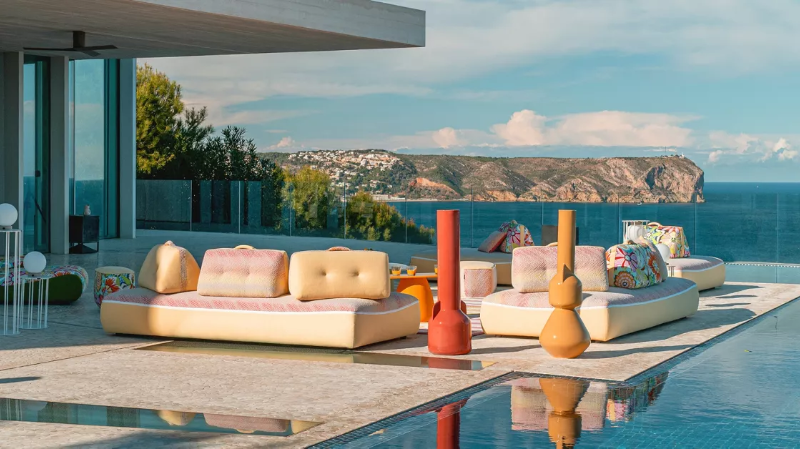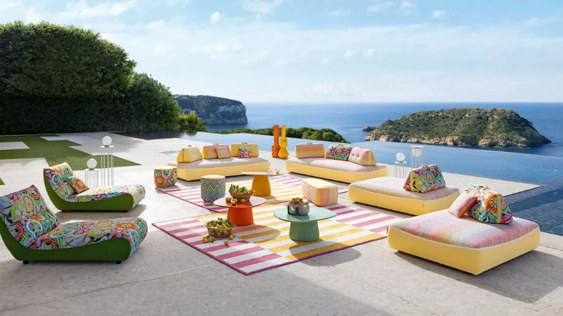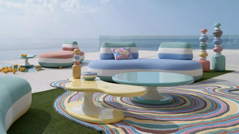 Colour now appears even in the structure — tables lacquered in bold tones, chairs with high-shine surfaces that retain their tone in full sun. The Missoni upholstery and Bombom’s pastel palette place Roche Bobois squarely within this shift.
