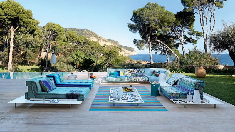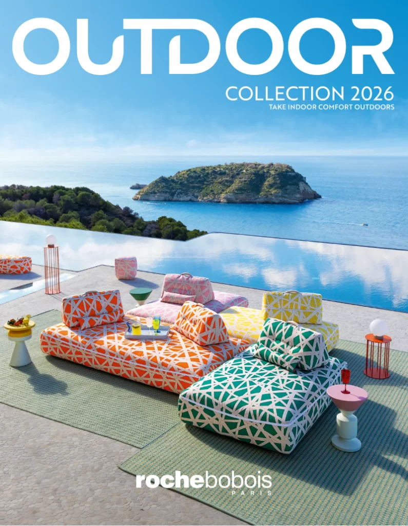 One of the defining signatures of the 2026 outdoor collection is the extensive use of Missoni fabrics across multiple pieces — Formentera, Mah Jong Outdoor, and others. The Italian fashion house’s geometric and colourful textile language translates spectacularly into outdoor upholstery, bringing a vibrancy and artisanal quality that plain solution-dyed fabrics simply cannot match. It is a partnership that elevates both parties and confirms Roche Bobois’s long-standing commitment to treating outdoor furniture with the same creative seriousness as indoor design.
