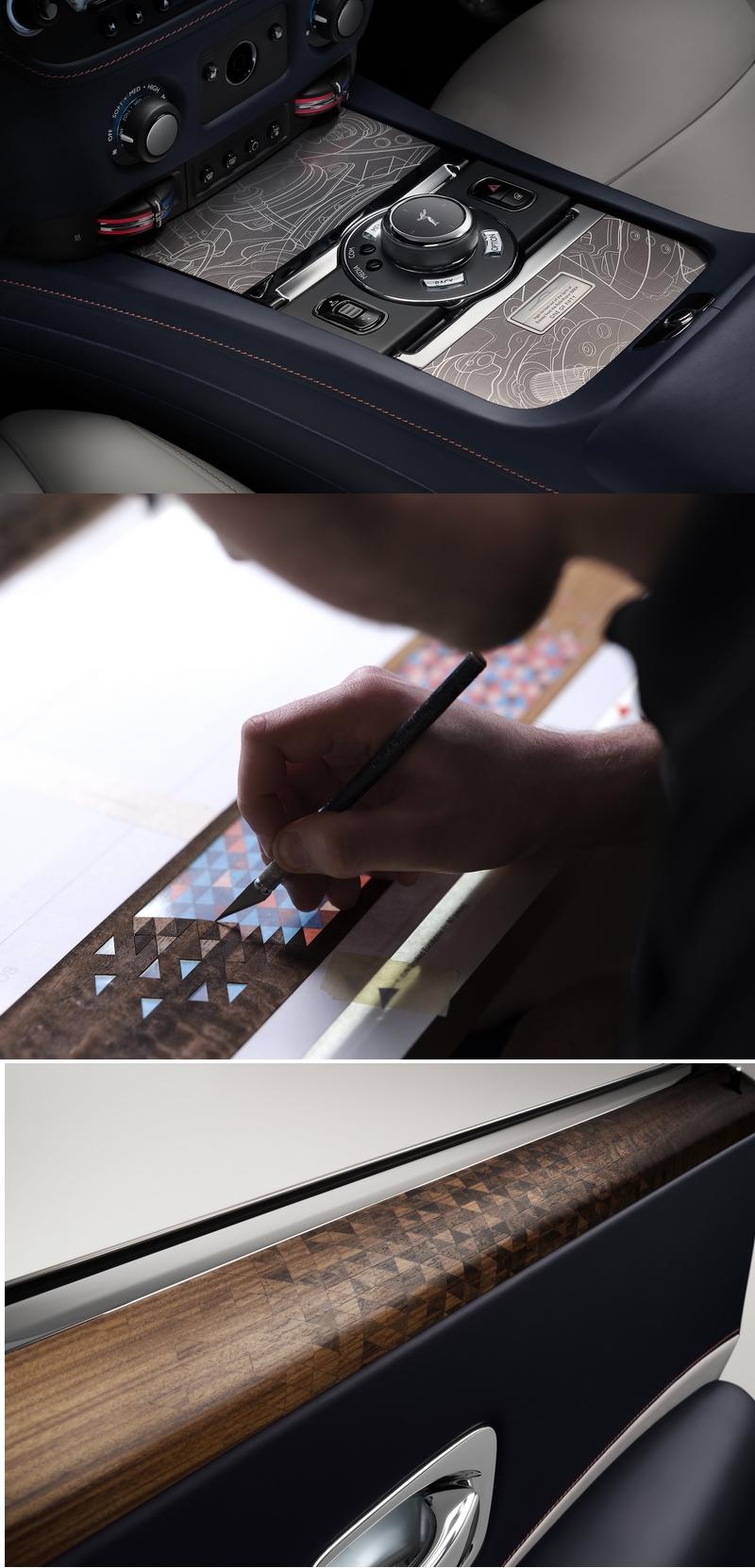 Available in either wood, Technical fibre or piano finished veneer, the door marquetry transitions from the driver’s suite to passenger suite, emphasizing the dual nature to Ghost.