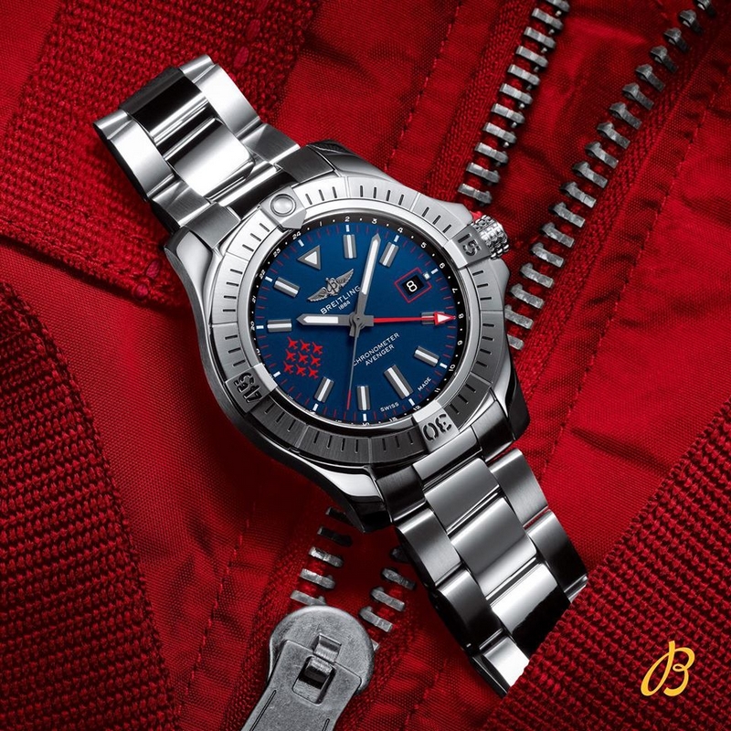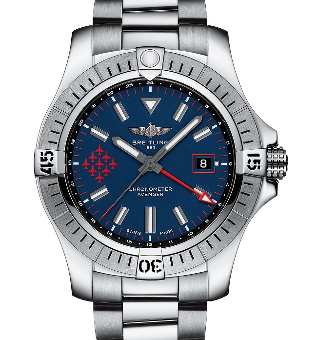 The Avenger Automatic GMT 45 Red Arrows Limited Edition features a sturdy 45mm stainless-steel case, blue dial with the distinctive 9 red arrows and a stainless-steel bracelet.