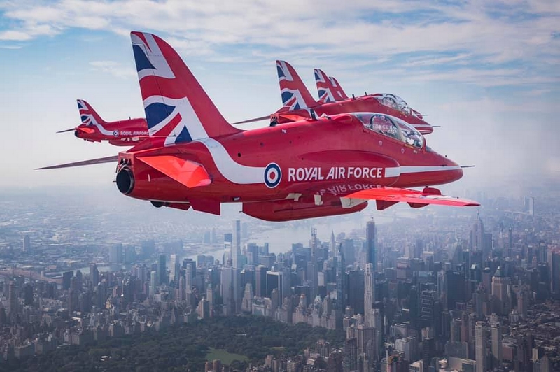 Since 1965, the Red Arrows have earned a reputation as one of the world’s premier aerobatic display teams and represent the speed, agility and precision of the Royal Air Force. With their famous ‘Diamond Nine’ shape and combination of close formations and precision flying in Hawk fast-jets, Red Arrows pilots represent the very best in flying and operational excellence.