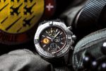 The Breitling Avenger Swiss Air Force Team Limited Edition has a 45 mm stainless-steel case with a ratcheted unidirectional rotating bezel. Its striking black dial features the logo of the Patrouille Suisse squadron on the subdial at 9 o’clock as well as distinctive yellow and red accents that reflect the colors of the Patrouille Suisse squadron’s logo. The yellow-tipped second hand adds another dash of color. The hands and the black indexes are coated with Super-LumiNova, a luminescent material that makes them easily readable in all lighting conditions. The caseback is engraved with the Patrouille Suisse squadron’s 55thanniversary logo – a stylized 55 and six supersonic jets in flight – along with the words “ONE OF 550”, an indication of its special limited-edition status.