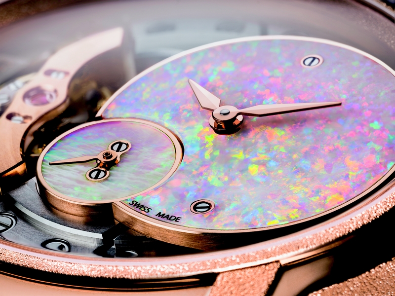 White opal appears for the first time in the Millenary collection, framed by the scintillating Frosted Goldfinish. Beautifully crafted gold bracelets woven in the Polish style add a a vintage touch to this unique women’s collection.