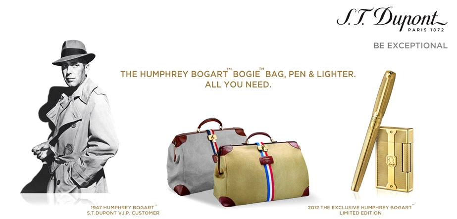 S.T. Dupont’s one hundred fortieth anniversary is celebrated with a Humphrey Bogart Collection. The iconic actor placed a bespoke order with this company in 1947 and is honored by the French high-end manufacturer with a travel bag, a pen, and an eighteen carat gold lighter featuring Bogart’s signature and silhouette. The Humphrey Bogart, Bogie bag, pen and lighter. All you need.