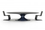 The Royale lounge table accurately interprets the Bugatti characteristic style features: a piece of furniture suitable for the elegant mood of high-end houses. The wide oval shape is developed from an extremely light aluminium frame, laser cut and carved with geometrical patterns taken over by the Bugatti interiors. The table top is in smoked tempered glass back lacquered in the iconic blue of the collection. The table is also available as a coffee table.