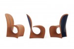 The famous Cobra Chair re-interprets in a contemporary way the early version designed and accomplished by Carlo Bugatti in 1902. This cutting edge and innovative chair combines back, frame and seat in a single element with curved and continuous lines, interrupted only by a gap conceived to contain the tails of a tailcoat referring to the purpose of Carlo Bugatti’s original version. Upholstered in cognac leather, the wooden frame has been replaced by a performing solution in carbon fibre painted in BlueRoyale colour on the rear part. It is enriched by a blue leather piping and by the characteristic EB monogram.