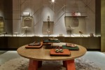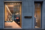 Santoni collaborated with architect Patricia Urquiola to bring the concept to life in the retail space. Precise artisan craftsmanship and creativity used to create each pair of Santoni shoes gave Urquiola the inspiration to enclose the space in a modular grid of geometric shapes. Throughout the two rooms, Urquiola uses materials of the highest natural quality which include polished walnut paneling and a geometric network of metal brass.