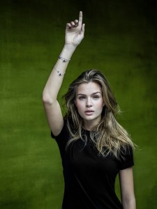 Model Josephine Skriver raises her hand for Save the Children and Bulgari