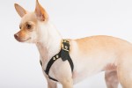 The Lux Dog Harness is made from premium-grade, black stingray leather. Each harness is finished with an under layer of ultra soft leather. The hardware is plated in 24k yellow gold and sparkles with over a carat of color DE, clarity VVS, natural, conflict-free diamonds. The hardware includes a selection of Brikk’s signature seven- sided Heptagon studs with a diamond tip and a diamond encrusted buckle.