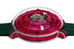 Jacob & Co Mystery Tourbillon watch for ladies features two triple-axis tourbillons placed back-to-back in the exact center of the timepiece. Two “mystery” disks, set with blood-red rubies, turn to show the time, the hour and minute indications realized by single white diamonds.