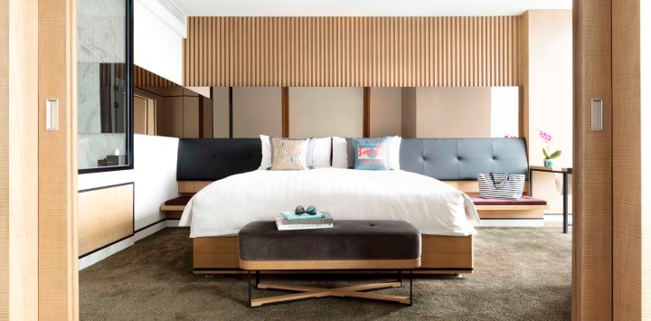 The Jen 75 corner rooms offer some of the best views of the city and CCTV building. Both Jen 75 and the Jen 75 Skyline rooms start at 75 square metres and offer more space for guests and entertaining. With a kitchenette and breakfast bar, the open concept allows for seamless movement from living room to bedroom and caters to short or extended stays.