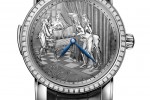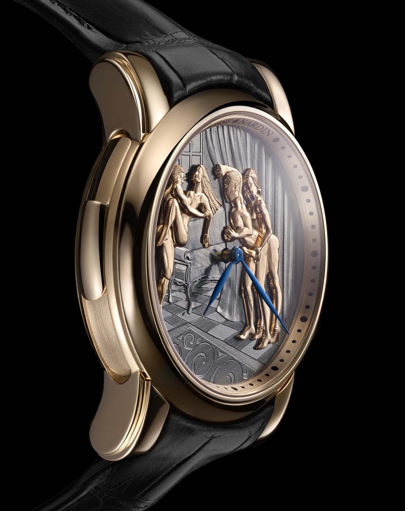 The enticingly erotic Jaquemarts on the Classic Voyeur’s anthracite grey dial are of a different order all together: two beautifully proportioned couples fashioned from 18-carat pink gold or white gold and caught “inflagrante delicto.” In the foreground, one couple stand in their nightclothes, the woman behind the man, in a Louis XIV salon complete with meticulously engraved canapé and carpet. The man has pulled open a curtain dividing the room to reveal not just the time, but a naked couple, making passionate love. Each press of the button makes the background lovers move.
