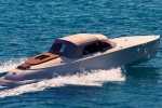 The inviting cockpit of the Hermes Speedster luxury boat offers space for up to five people, two of whom can sit on the chairs at the helm and three on the elegant rear bench seat. The easy-to operate convertible top allows the boat to be used even in slightly gloomy weather conditions. Optionally, a small sun lounger can be placed on the engine cover at the stern to allow guests to dry themselves after bathing.