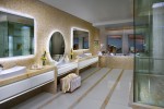 These Las Vegas suites feature a master bedroom and bathroom with his-and-her walk-in closets and a stunning gold leaf headboard. The master bathroom has two walk-in steam showers with LED showerheads, private water closets, LED backlit mirrors, and a spacious whirlpool spa for two. The lavish whirlpool tub is wrapped in marble mosaic with a massage function, air jets with LED lights, a computer control panel, a TV and Kohler water filler from the ceiling. Each of these penthouse apartment-style suites also includes a wet bar, private spa/massage room and office.