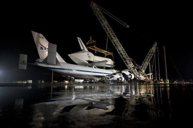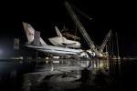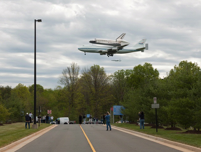Space shuttle Discovery, the world’s most traveled spaceship, moved into its new home at the Smithsonian’s National Air and Space Museum in northern Virginia. Discovery, mated to a specially modified Boeing 747, landed at Washington-Dulles International, where it was de- mated from the Shuttle Carrier Aircraft and made ready for towing to the Museum for the Welcome Discovery ceremony on April 19.