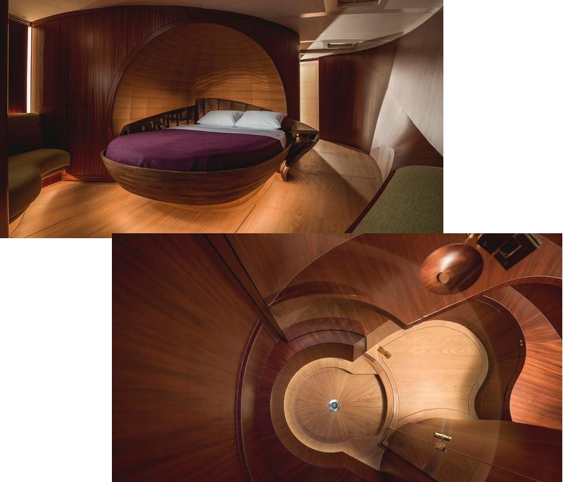 Spirit Yachts head designer Sean McMillan commented: “The Spirit 111 has been completely customised throughout and as a result her interior is totally unique. The design is a never-ending swirl of organic shapes, encompassing the practicalities necessary in a yacht but in a highly imaginative way.”