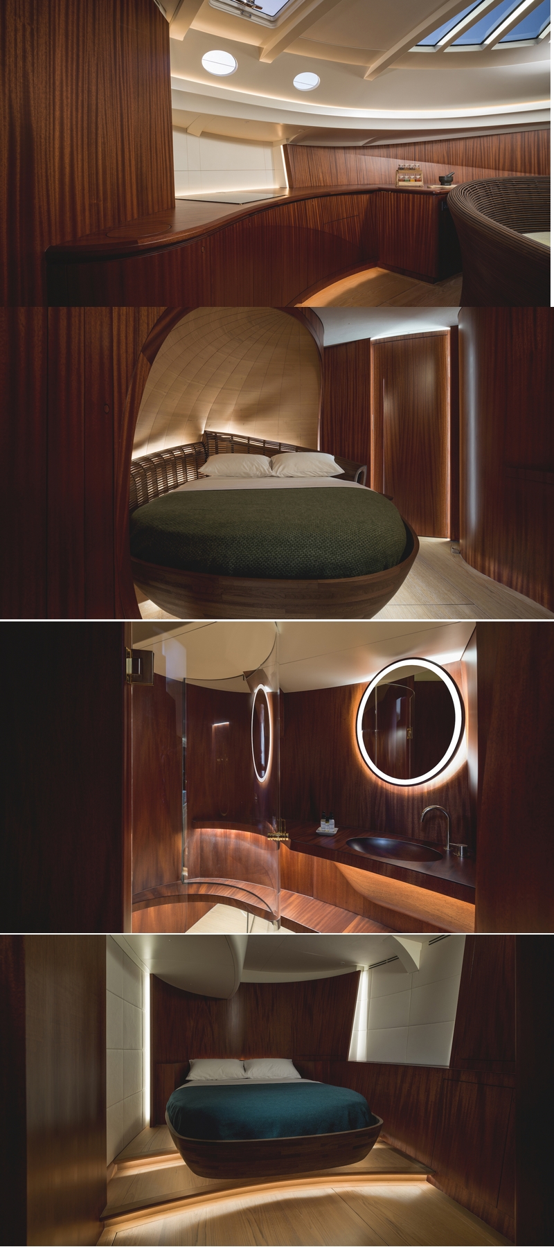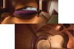 Down below, walls and bulkheads flow in an ‘S’ shape through the interior, which has a natural look and feel thanks to the combination of the exposed Sipo, teak and American Walnut timbers on show. A bespoke, curved American Walnut seating arrangement takes centre stage in the open plan saloon-galley and C-shaped arrangements created from steamed timber curve over the beds in the owner’s and VIP cabins. Discreet doors with hidden, sensor-activated recesses, rather than visible door handles, ensure smooth lines and a contoured look throughout.