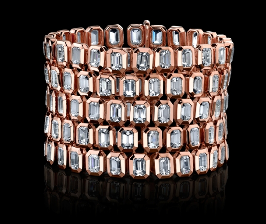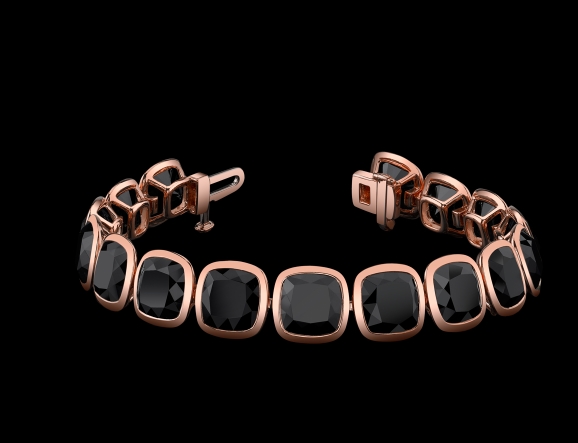 Each gem is a natural black spinel faceted like the classic cushion shape diamond. The necklace is sculpted in 18K rose gold and has 47 black spinels with a total weight of 74.35 ct.