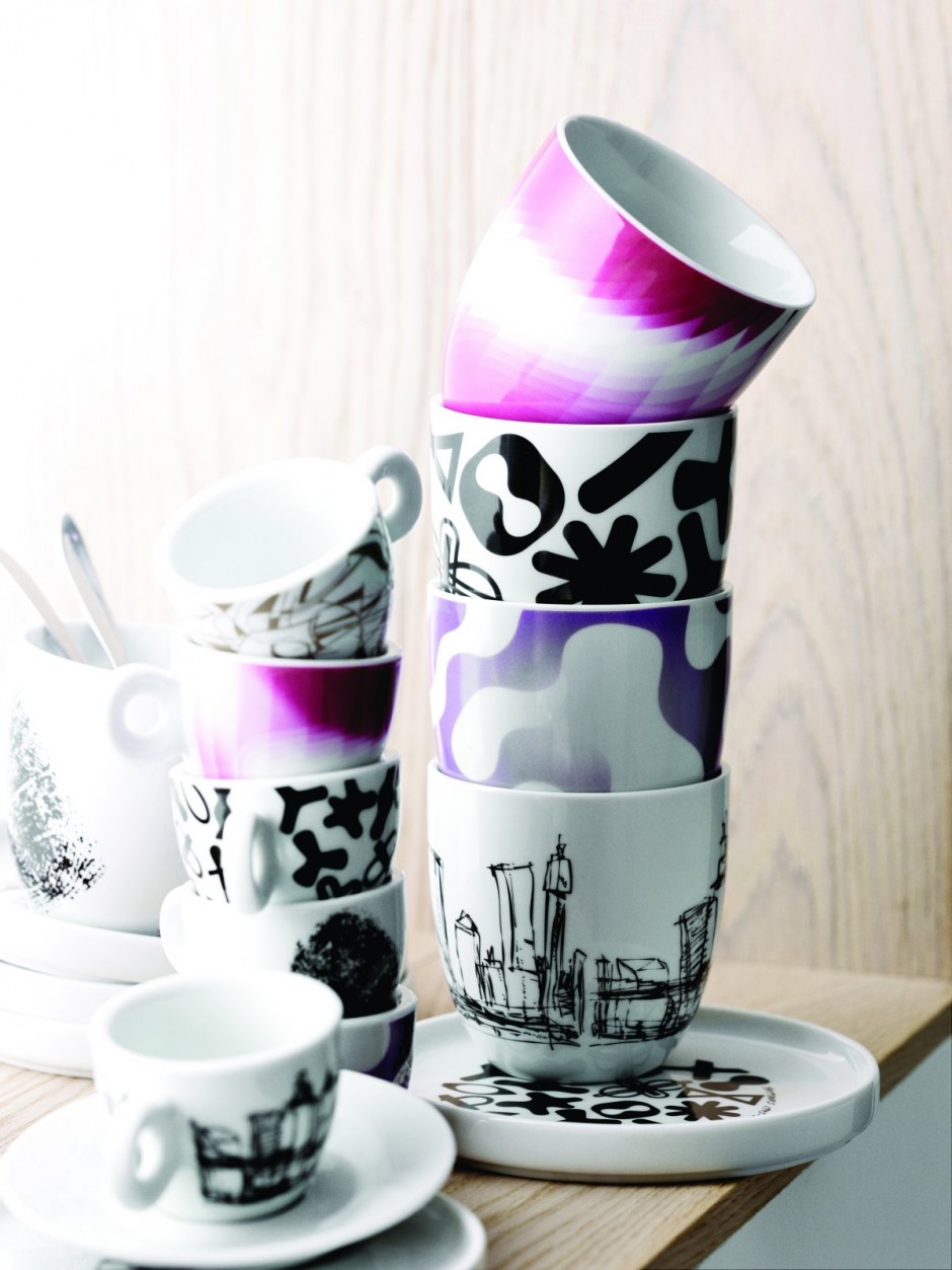 Discover the world’s most prestigious gatherings & exhibitionsA cheerful color palette of puzzle shaped vases, a futuristic bright orange pendant lamp, a coordinating glass touch lamp with the same bright orange cord, a hand-made aluminum bowl designed to form a pattern, and a set of originally designed cups, espresso cups and rimmed saucers that celebrate Karim Rashid’s art.