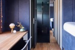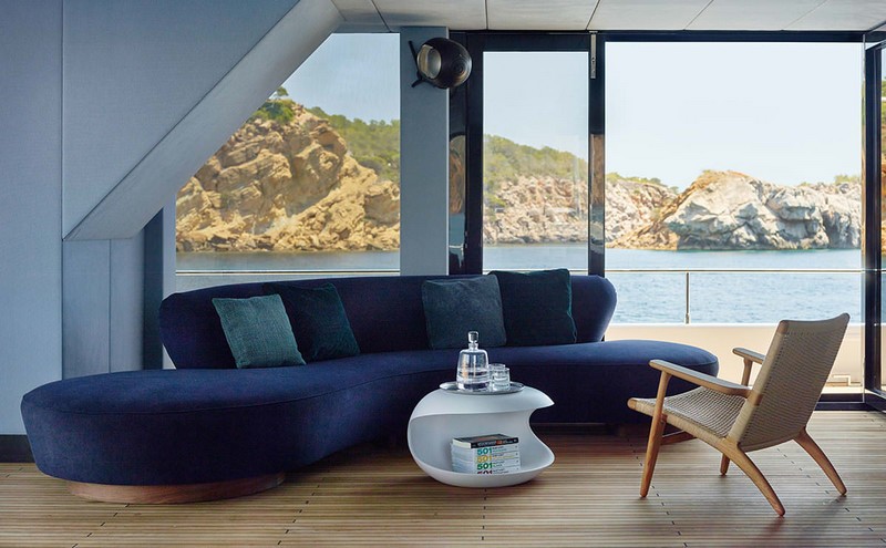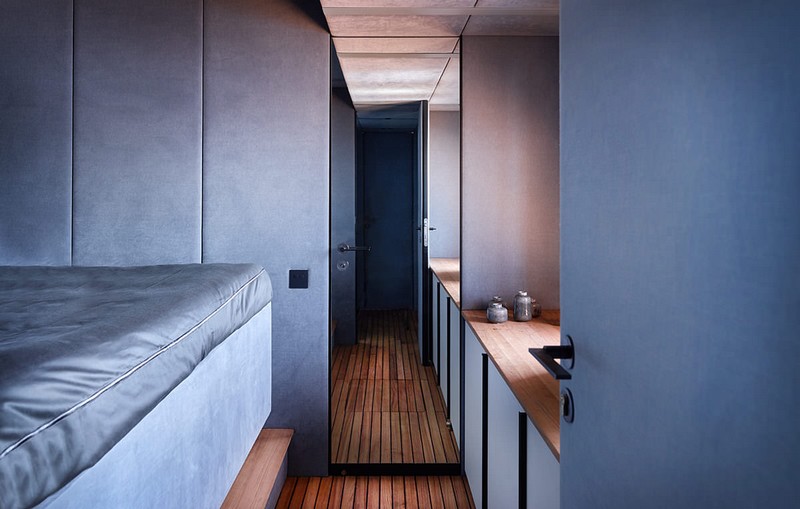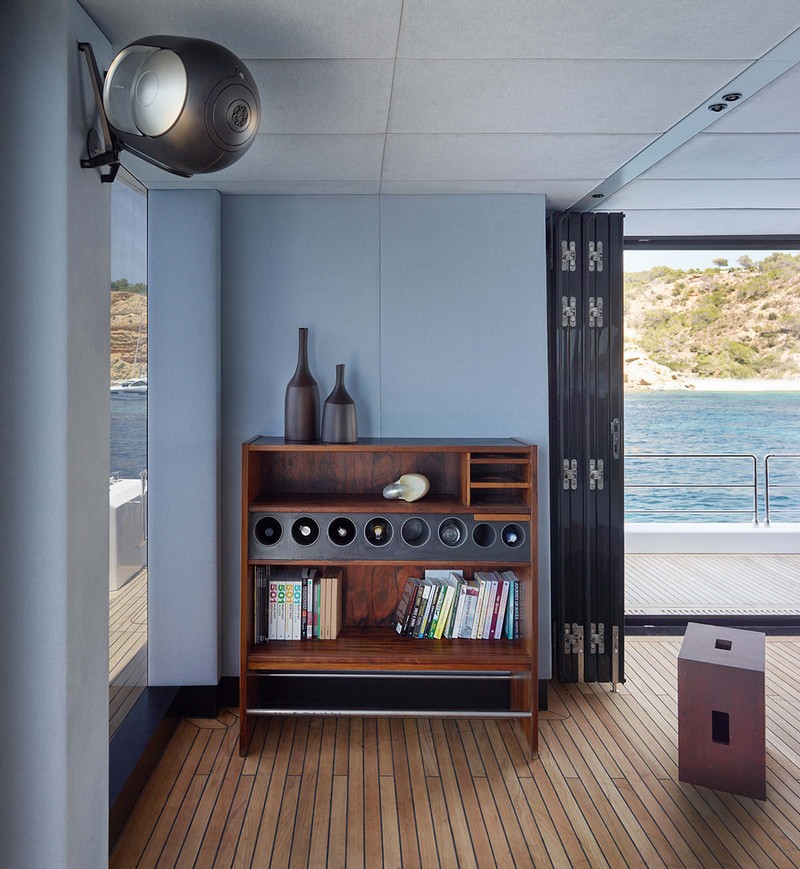 A customized Devialet loudspeaker is at hand to set the mood. Midori’s floors and deck are entirely clad in teak wood and the walls are kept in a soothing smoke blue tone.