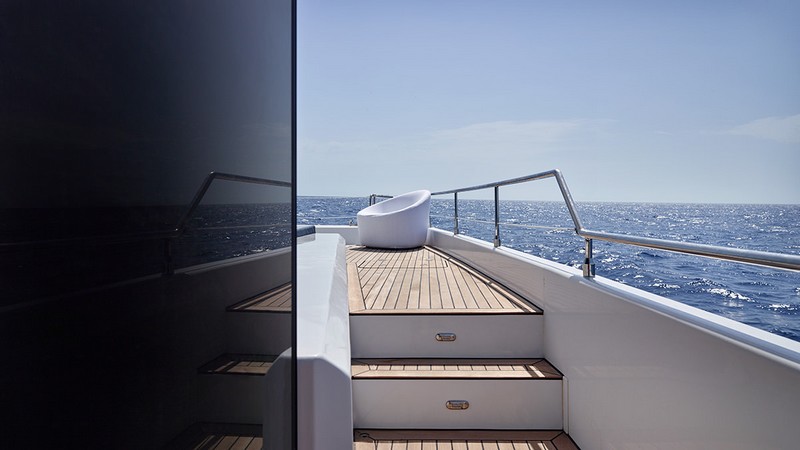 The yacht’s front terrace is the place to relax on large sun pads or to enjoy a bath in the Jacuzzi.