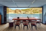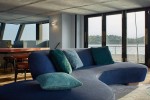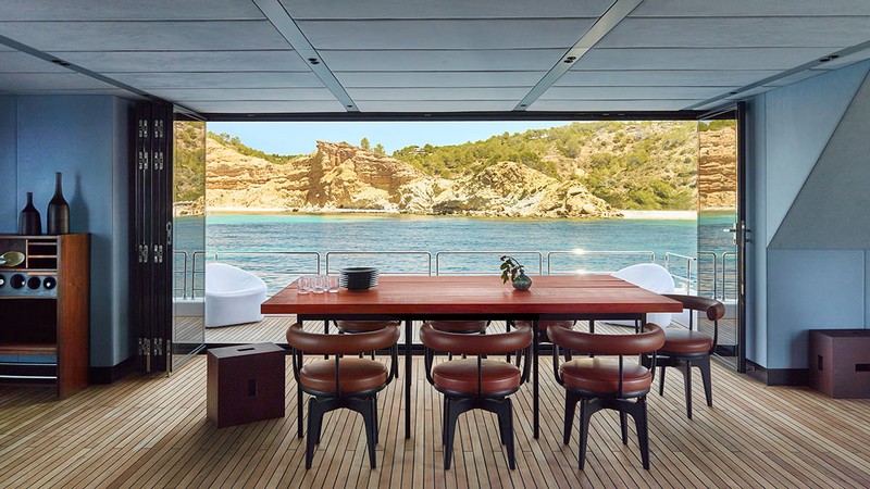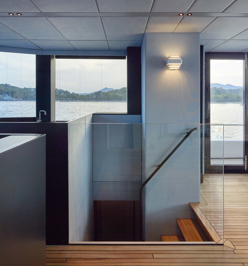 Midori’s vast saloon surrounded with full-height windows spans over 65m2 of smartly used living surface. Its bow section features a large galley stretching over the room’s entire width. The space under the centrally placed countertop conceals fridges, freezers, a wine cooler and a Hoshizaki cube ice maker. Ample storage spaces and kitchen appliances are discretely covered with black matte panels found over the entire bow area of the main room. The central countertop neighbors a large dining table with seating for eight.