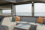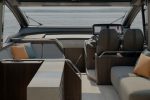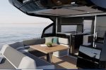 In a standard arrangement, the aft cockpit comprises of comfortable seating backing onto a large sunpad over the garage and a social bar unit with matching stools on the port side. Owners can opt for a fully integrated wet bar or extended J-shaped lounge seating running aft from the galley across the width of the cockpit if desired. This new model benefits from an optional crew cabin, accessed via a dedicated stairwell in the aft cockpit.