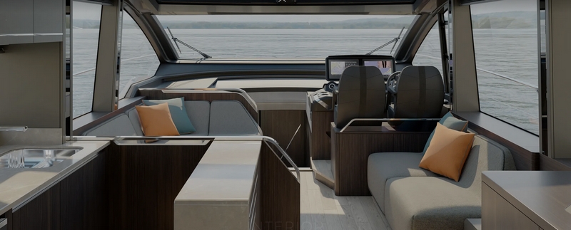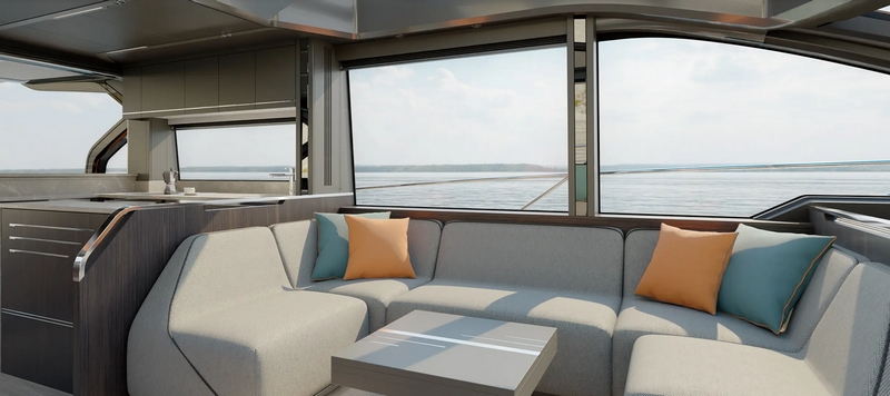 In a standard arrangement, the aft cockpit comprises of comfortable seating backing onto a large sunpad over the garage and a social bar unit with matching stools on the port side. Owners can opt for a fully integrated wet bar or extended J-shaped lounge seating running aft from the galley across the width of the cockpit if desired. This new model benefits from an optional crew cabin, accessed via a dedicated stairwell in the aft cockpit.