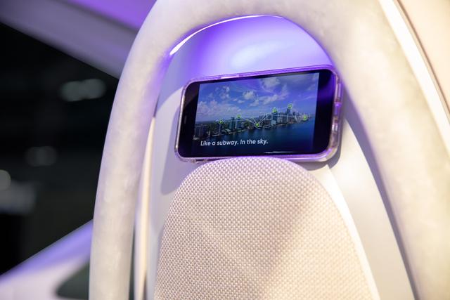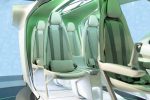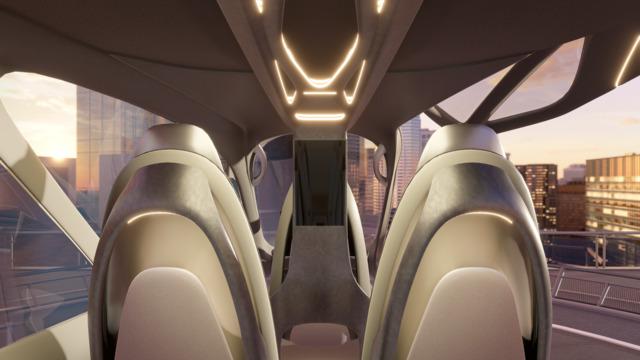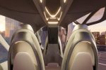 The team of engineers and designers utilized the automotive industry’s reductive design approach to create the light-weight interior cabin, which is made of forged carbon fiber. Ergonomically contoured seats offer a cocoon-like environment for passengers. Deployable seat consoles mimic automobile center consoles and provide a charging station and stowage compartment for personal items. Grab handles built into the cabin doors and seatbacks assist with ingress and egress. A combination of lighting – including overhead lights inspired by automobile sunroofs – adjusts with the various stages of flight to emulate a “light therapy” effect. The cabin layout draws on automotive space innovation with a minimized bulkhead, which allows for generous headroom and package functionalities.