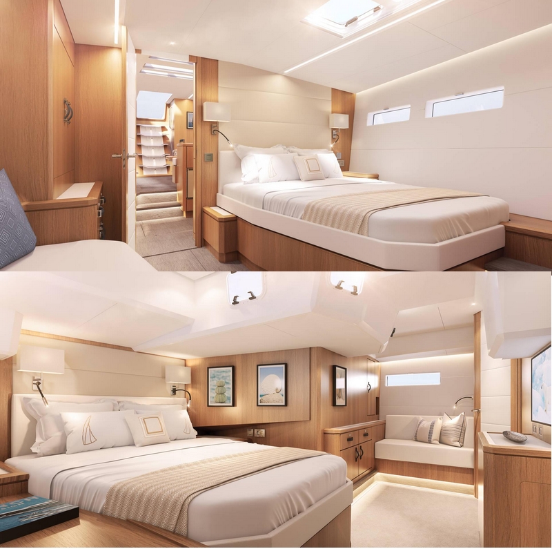 First off, the forepeak: three versions are possible, with a sail locker, a skipper cabin or a real sixth cabin.