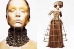 Cages, corsets and crinolines in various incarnations, the sculpted shapes of Alexander McQueen’s 2013 Spring Summer pieces are put in value with honey. British photographer David Sims lensed Brazilian model Raquel Zimmermann poured with honey for the new ad campaign. The spring 2013 visual for Alexander McQueen is inspired by the runway show’s beekeeper theme and the return to a heritage silhouette with Wasp waists. Cages, corsets and crinolines in various incarnations