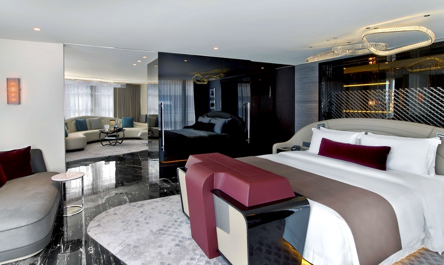 The living room features a bespoke built-in sofa crafted from Bentley leather, which brings Bentley’s unique motoring luxury indoors. The sofa, equipped with two champagne bottle coolers, features signature Bentley diamond upholstery with curved lines that echo the architecture of the suite. Overhanging the scene, a captivating light installation based on the Continental’s jewelled headlights and the sinuous curves of the Nürburgring Racetrack completes the room.