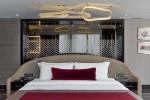 The living room features a bespoke built-in sofa crafted from Bentley leather, which brings Bentley’s unique motoring luxury indoors. The sofa, equipped with two champagne bottle coolers, features signature Bentley diamond upholstery with curved lines that echo the architecture of the suite. Overhanging the scene, a captivating light installation based on the Continental’s jewelled headlights and the sinuous curves of the Nürburgring Racetrack completes the room.
