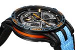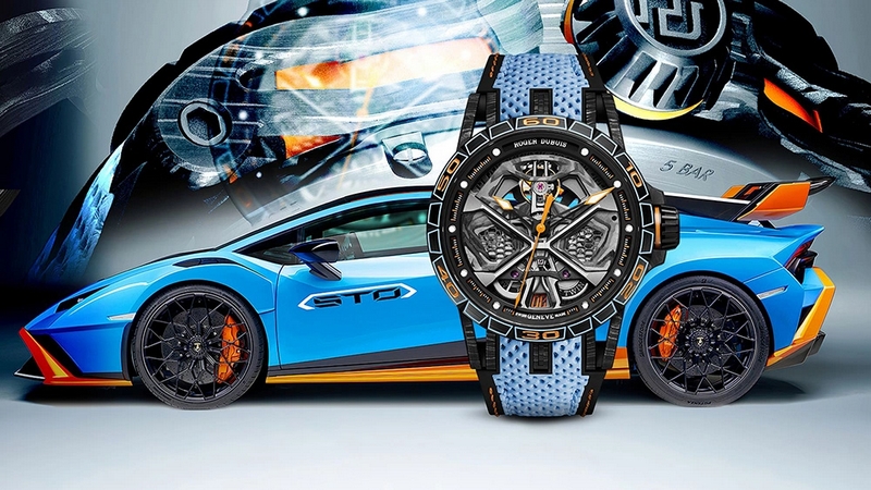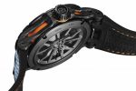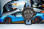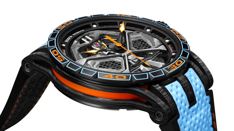 The latter reproduces the same kind of speed effect as a Huracán wheel and is a representation of the movement signature associated with Lamborghini Squadra Corse. Topped with an upper calibre with a strut-bar design bridge reminiscent of those found on the V10 engine of the Lamborghini Huracán supercar itself, the Roger Dubuis Excalibur Huracán STO is housed in a sleek carbon watch case with a black DLC titanium bezel. Setting a vibrant finishing touch is an original strap on which perforated blue calfskin leather allows a sizzling view of orange fabric overlaying a comfortable rubber inner.