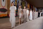 The apparent simplicity of off-the-shoulder gowns reveals hours of meticulous handmade craft. Each minute rhinestone is the fruit of technical prowess and expert gestures, including a chiffon gown that transmutes into a bird’s wing, embroidered with delicate feathers and sparkling gemstones. The setting for the show was itself a trompe-l’œil, featuring works by celebrated Indian artists Madhvi and Manu Parekh on the walls in majestic embroidered renditions created by the Chanakya School of Craft in Mumbai.