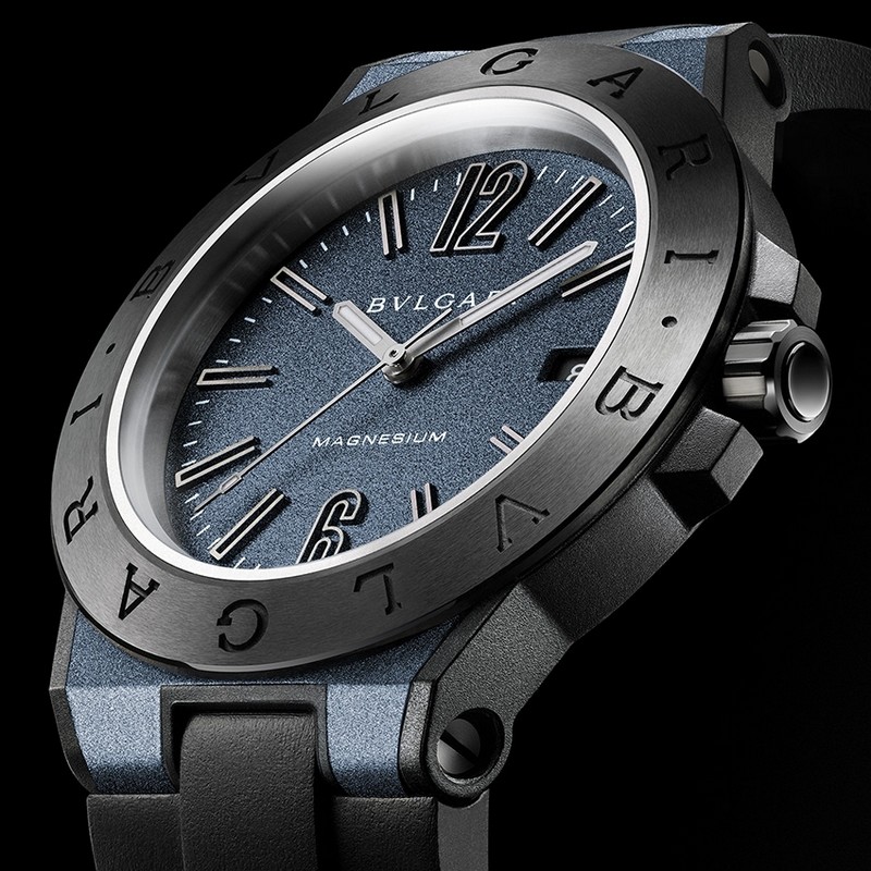 Diagono “E” Magnesium intelligent watch is powered by the self-winding manufacture caliber Solotempo (with a 28,800-vph frequency and a 42-hour power reserve), with the only electronic components being a cryptographic system embedded into the watch and equipped with WISeKey’s NFCTrusted (Encrypted Near Field Communication) technology. This enables the watch to transmit a digital certificate to the “Bulgari Vault,” an app that the owner downloads and sets up on