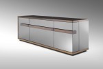 The Bryant sideboard is enhanced by its new proportions. Highlighted by its sculptural allure, Fendi Casa Bryant sideboard celebrates a granite-like aesthetic. Finely crafted, it features an Ebony Macassar top and mirror glass shutters defined by the graphic touch of the handle matching with the metal finish of the frame.