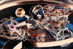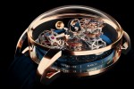 On the first satellite lies the amazing triple axis gravitational tourbillon, which rotates on one axis in 60 seconds, on the second axis every 5 minutes, and around the dial every 20 minutes.On the second satellite is the time (hours and minutes) subdial. Thanks to a clever differential gear system, the time display is always in the correct position while it rotates around the dial. The “12” marker is always facing upwards.